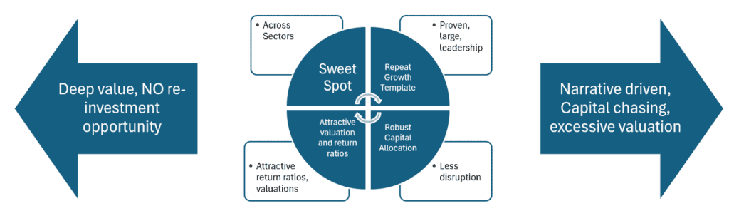 This white space exists between two extremes. On one end are great companies with little reinvestment opportunity for growth. On the other end are companies where capital is chasing narrative over numbers, with valuations completely divorced from any conventional wisdom.