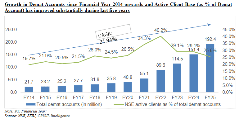 India had 2 crore demat accounts in FY14 which grew at a CAGR of 11% to reach 4 crore in FY20, in a span of 6 years. But between 2020 and 2025 however, the demat accounts in the system shot up from 4 crore to 19 crore, nearly a 5X increase in 5 Years.