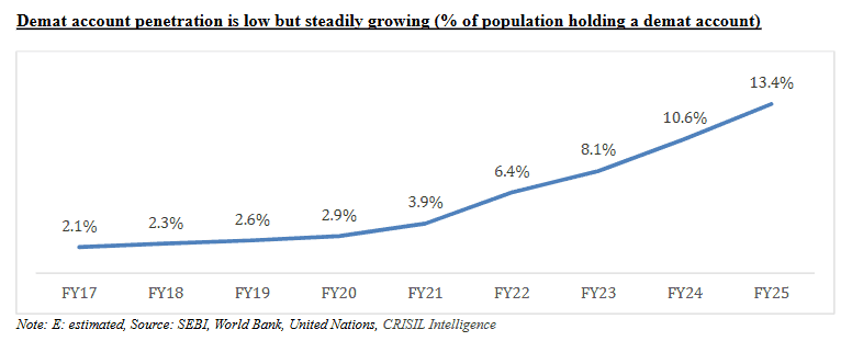 Note: The total number of demat accounts at 19 crores roughly translates to a penetration of 13-14% of the population and that is the rough math available. The actual penetration could be far lower if looked at based on unique PAN identification.