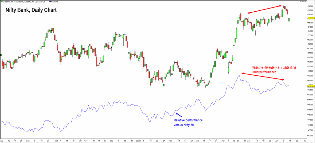 As highlighted in the chart above, there is a glaring negative divergence between the price action and the relative performance, suggesting one should be cautious in this sector. Though the price trend is still bullish, it would be prudent to wait for signs of outperformance before enhancing exposures in this sector. A fall below 53,000 would be an early sign of weakness and could open up more downside threat for the bank index. The index has to pick up momentum and also move past the 58,000 mark to suggest resumption of uptrend.