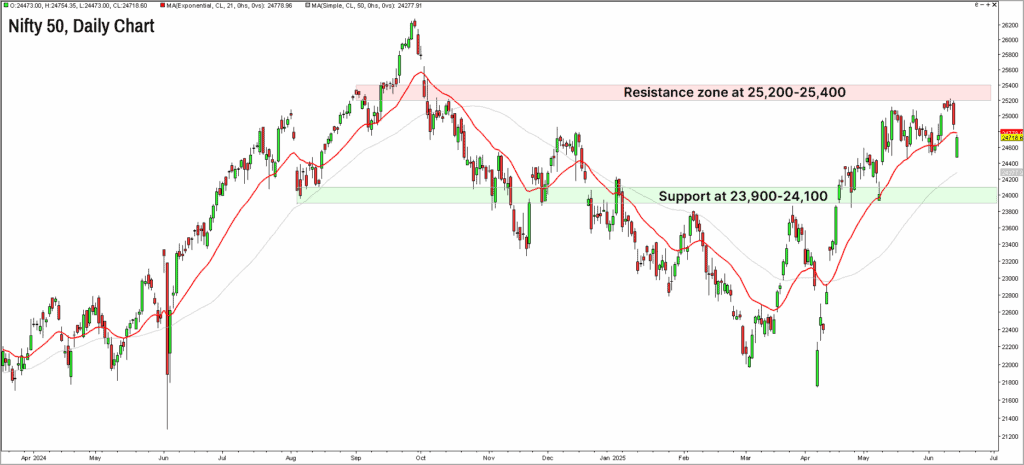 We had sounded caution in the previous update highlighting that the Nifty 50 index has to move past the crucial resistance zone at 25,200-25,400 to indicate the scope for further bullishness. The Nifty 50 index is still struggling to get past this hurdle, suggesting that the recent sideways and volatile price action is likely to sustain.