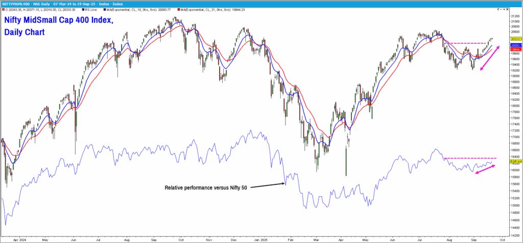 Though this index has coasted higher along with the recent recovery in the Nifty 50 index, there is no signs of relative outperformance yet. Have a look at the daily chart of the MidSmall Cap 400 index featured below. The thin blue line captures the relative performance of this index versus the Nifty 50 index.