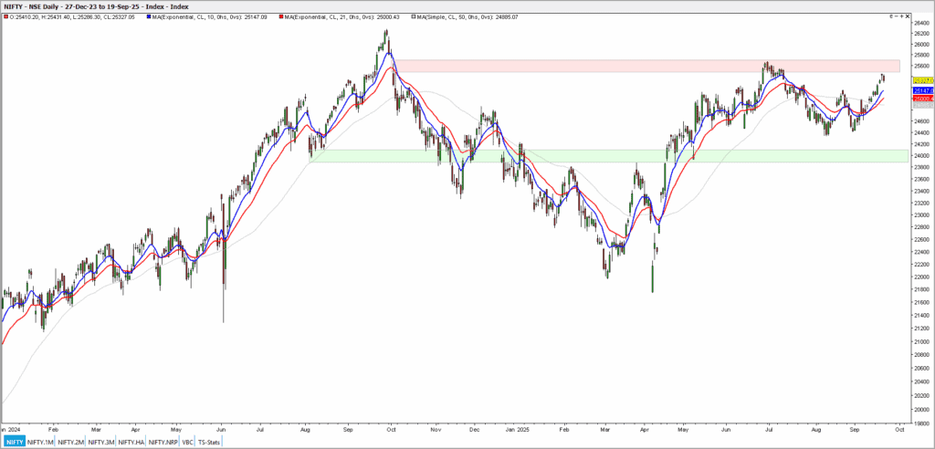 We shall try to address this question with a look at the short-term outlook. Though the Nifty 50 index managed to creep higher, it is still within the broad range of 23,900-25,600. So we shall take a closer look at the short-term chart of Nifty 50 index along with the breadth indicators, as we always do, to assess what is in store in the near-term. We will also dive deeper into the sectors displaying relative strength and weakness.