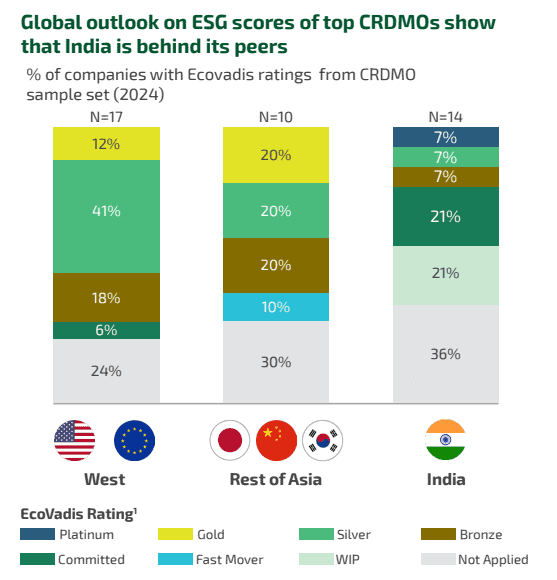 Complying with sustainability goals is not easy – they require capital investment and access to green utilities. A study by BCG in partnership with IPSO (Innovative Pharmaceutical Services Organisation – an industry body comprising 11 leading CRDMOs in India) indicates that Indian CRDMO firms lag behind their peers in the rest of the world in this area.