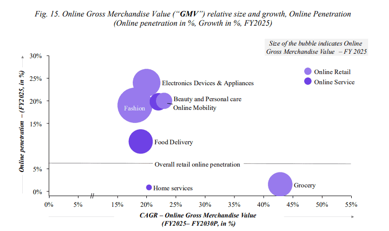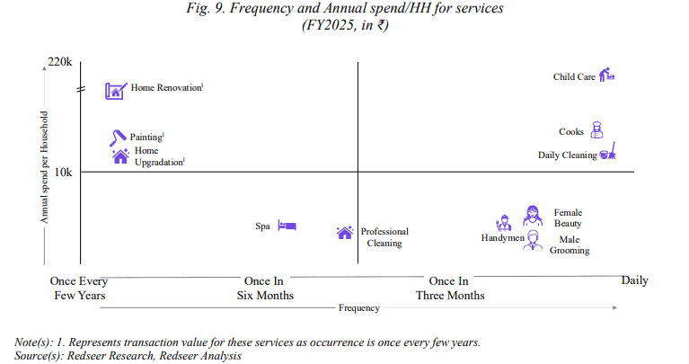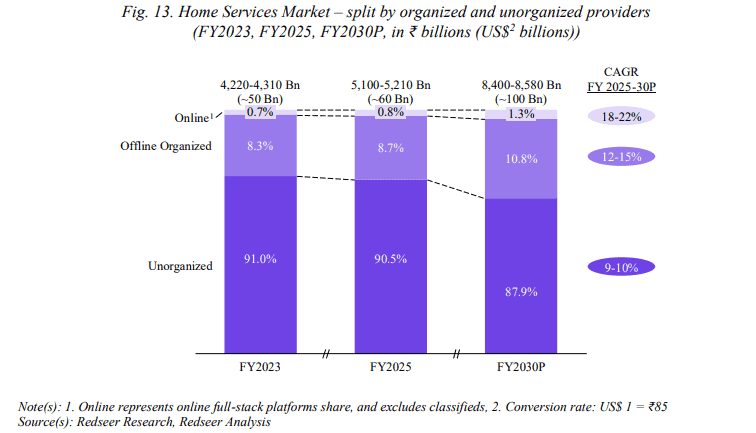 The home services market in urban India, where UC operates, is rapidly evolving and encompasses a wide array of services aimed at keeping the household running smoothly while enhancing convenience and quality of life for urbanites. According to Redseer Research, the total addressable market (TAM) for such services in physical terms is estimated at Rs.5,100-5,210 billion (~$60 billion) in FY2025, which is projected to grow at a CAGR of 10-11%, to reach Rs.8,400-8,580 billion (~$100 billion) in FY2030 driven by rising urbanization. The market is unorganized, fragmented, and offline, with overall online penetration of just <1% as of FY2025, based on net transaction value. Penetration in top 8 cities is slightly higher at 3.2%.