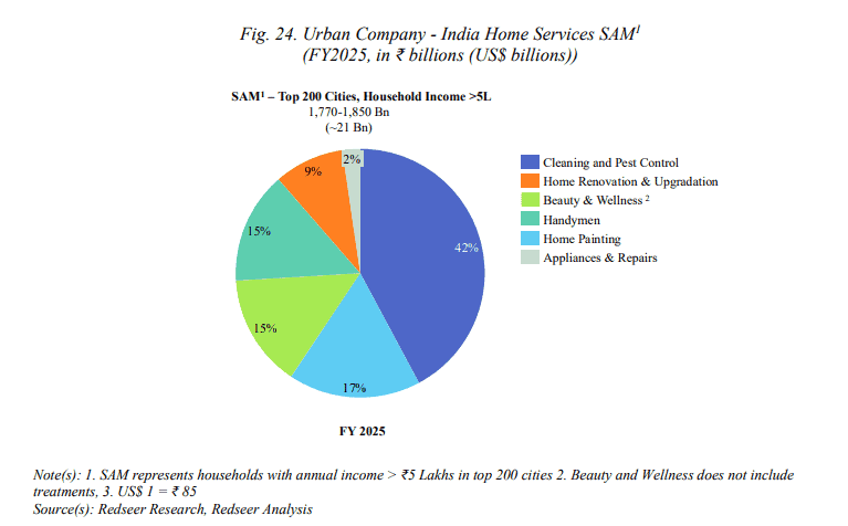 The home services market encompasses a diverse range of services, including beauty and wellness, daily and high-frequency cleaning, professional cleaning, handymen services, appliance servicing and repairs, among others. But cleaning and pest control services account for the largest share of the SAM, contributing ~42% to the market, followed by home painting, beauty and handymen services.