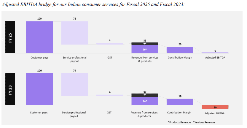 A combination of scale and in-house product consumption for services delivery (brand tie-ups, contract manufacturing) has led to an uptick in UC’s contribution margin and EBIDTA margin over the last three years. UC’s take rates are at 28% at services level and this translated into adjusted EBIDTA of 10% in FY25 for its India services business.